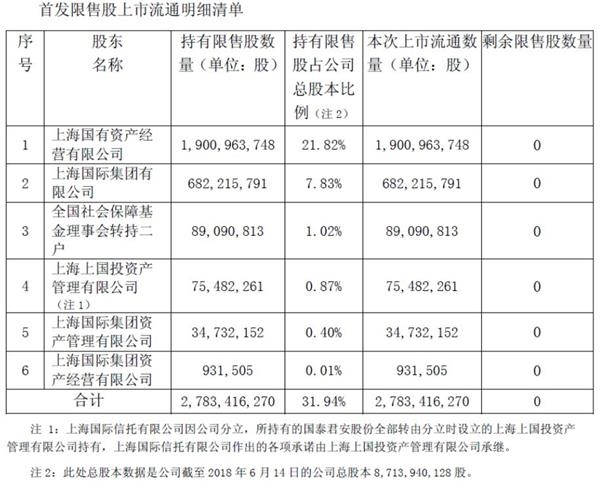 在本次解禁前,国泰君安已在2016年6月27日进行过一次解禁,当时解禁股份为32.49亿股,占公司总股本的42.61%。