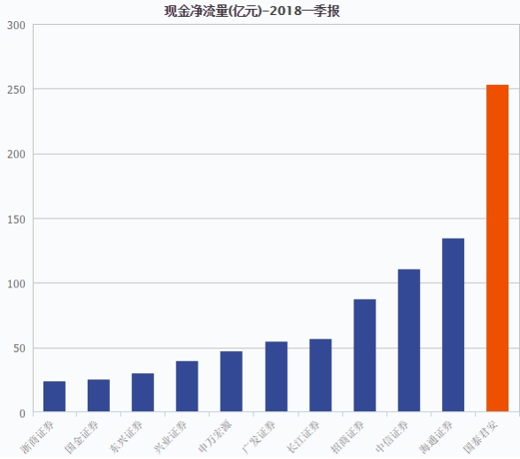 值得一提的是,国泰君安一季度实现现金流净流入253.19亿元,且主要是经营现金流净流入330.12亿元,一季度的现金流净额规模在上市券商中排名第一。