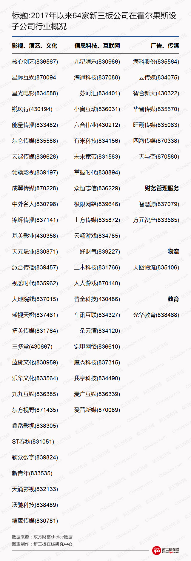据东方财富Choice数据不完全统计,截至7月19日,2017年以来至少有64家新三板挂牌公司先后在霍尔果斯设立子公司。