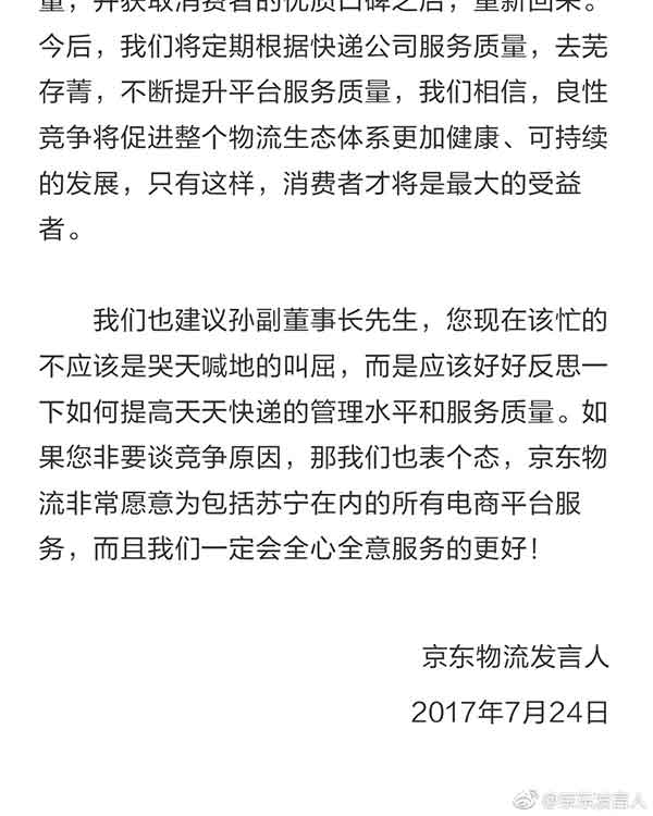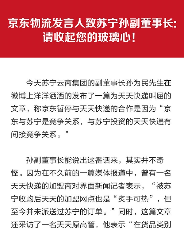 7月24日下午,京东发言人的官方微博发表题为《京东物流发言人致苏宁孙副董事长》的文章,直接反击苏宁云商集团股份有限公司副董事长孙为民——“请收起您的玻璃心!”