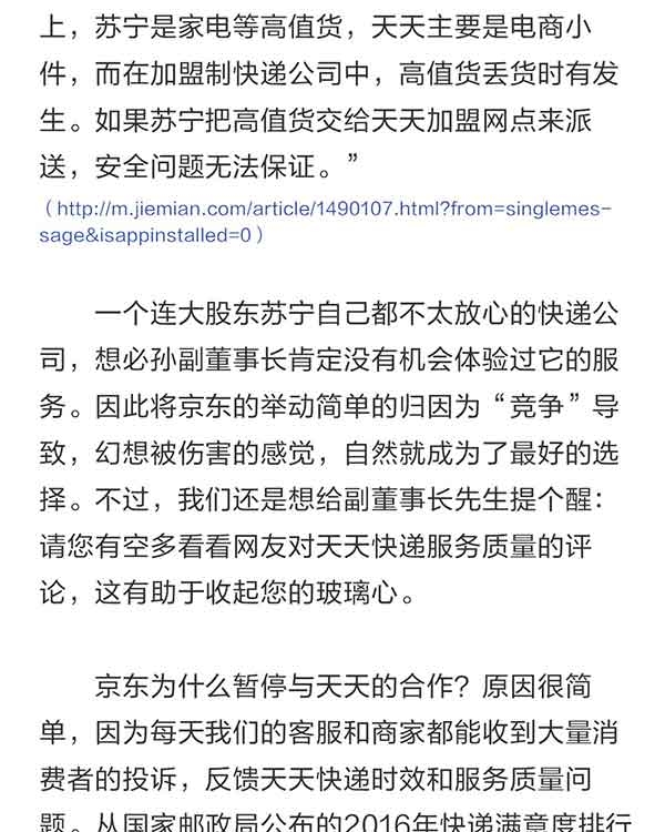 在这篇回应文章中,京东方面再次解释了与暂停与天天的合作原因。“因为每天我们的客服和商家都能收到大量消费者的投诉,反馈天天快递时效和服务质量问题。从国家邮政局公布的2016年快递满意度排行榜来看:天天在十大快递公司中排名倒数第二,在京东平台所有合作的第三方快递企业中排名最低。这件事的选择权其实并不在京东,而是在消费者心中。”京东物流发言人表示。