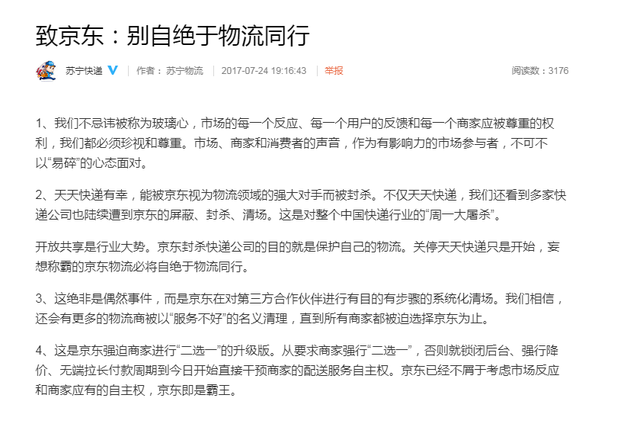 苏宁快递7月24日晚间在其官微发布名为《致京东:别自绝于物流同行》的声明,称不仅天天快递,还看到多家快递公司也陆续遭到京东的屏蔽、封杀、清场。