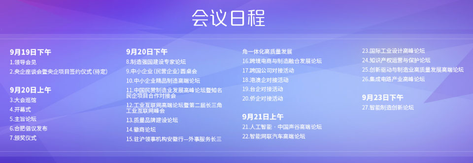 2019世界制造业大会经国务院批准,定于9月20日-23日在安徽省会合肥举办。