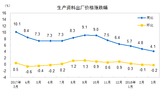 2018年3月份,全国工业生产者出厂价格同比上涨3.1%,环比下降0.2%。工业生产者购进价格同比上涨3.7%,环比下降0.3%。一季度,工业生产者出厂价格同比上涨3.7%,工业生产者购进价格同比上涨4.4%。