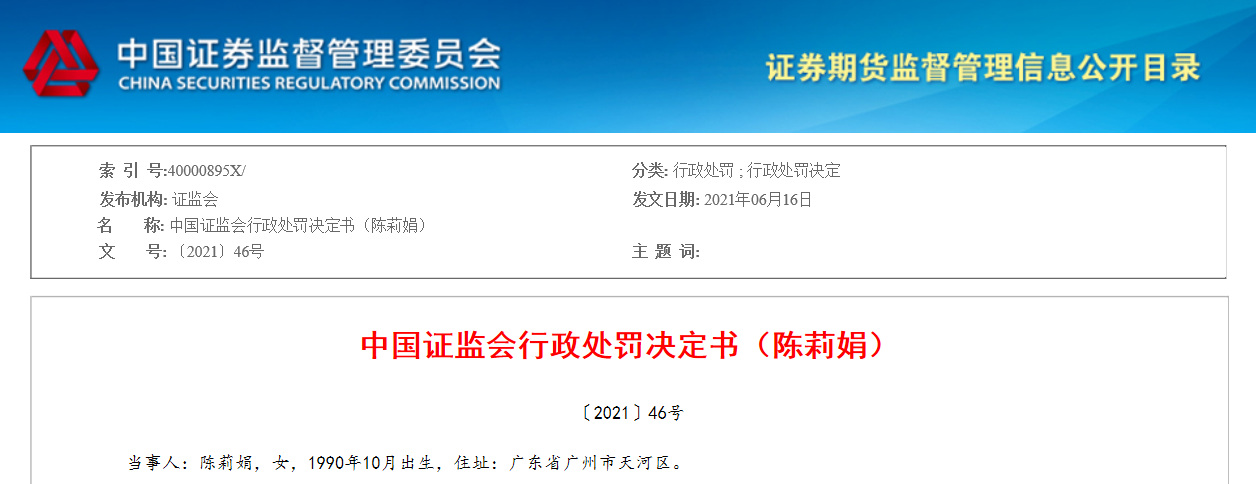 证监会同日披露的另一则行政处罚决定书对陈莉娟内幕交易乐通股份股票行为进行了立案调查、审理,决定对陈莉娟处以10万元罚款。