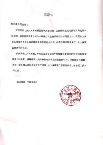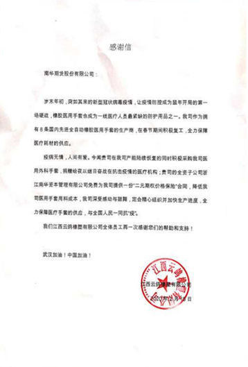 为此,南华期货的风险管理子公司南华资本积极响应 “发动期货行业力量,众志成城抗击疫情”的号召,根据企业实际复工产能情况主动为江西云鸽免费提供了一份“阶梯二元·橡胶期权”。其中合约标的为RU2005,为期两个月,第一个月生效100吨,同时自动生效次月的200吨期权,合计300吨天然橡胶,相当于保障了约450万副医用橡胶外科手套生产的原材料成本。若最终RU2005价格超过约定保障价,江西云鸽将获得南华资本的赔付,有效降低其采购医用橡胶外科手套的原料价格风险,保障疫情期间医用橡胶外科手套的生产供应。与此同时,为了表达对奋战在抗“疫”一线的医护人员的敬意,南华期货联合杭州橡胶同业会,共同出资向江西云鸽购买共计6万副,约150箱医用手套,无偿捐献给在杭医疗机构,共同抗“疫”。