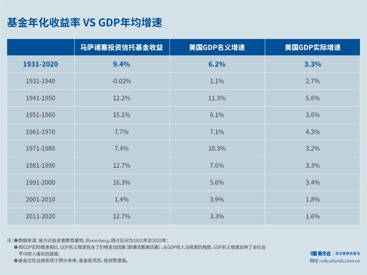 美国第一只开放式股票基金——马萨诸塞投资信托基金(MIT),从1924年7月成立到2021年9月底的近百年间,年化收益率为9.4%,累计收益率高达6351倍。几千倍的收益率是不是听起来非常诱人,甚至让你产生了“一夜暴富”的幻觉?其实,长期平均来看,基金年化收益率仅仅比GDP增速高几个百分点而已。