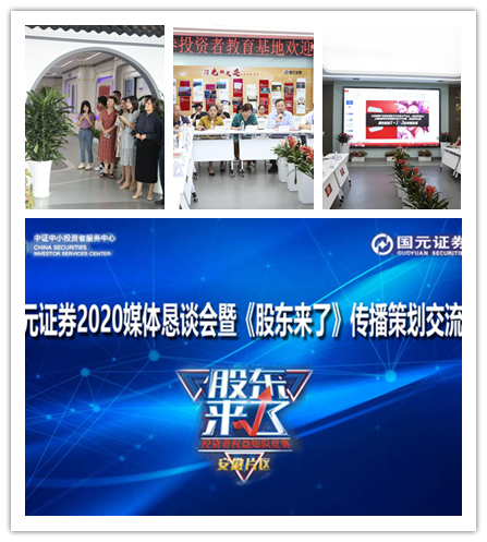 为了更好地举办和宣传本次活动,在安徽证监局指导下,国元证券于8月31日下午召开媒体恳谈会暨《股东来了》2020传播策划交流会。来自人民网、安徽新媒体集团、安徽新闻联播、安徽城市之声、新华中经社、新浪安徽、网易安徽、今日头条、凤凰安徽、中国证券报、上海证券报、老虎财经、大众证券报、骊鸣云等14家媒体的记者集聚国元证券投教基地,共同商讨《股东来了》2020活动策划及宣传方案。国元证券董事会秘书胡甲等、分支机构服务部总经理许静青、总裁办公室副主任李学友出席交流会。