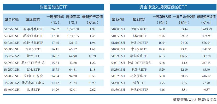 DeepSeek概念持续火热,其引领的科技股成为上周交易主线。软件、机器人、智能汽车等板块强势上涨,带动相关ETF大涨。香港科技ETF(513560)上周涨26.02%,位列全市场ETF之首;港股汽车ETF(520600)上涨17.68%,居次席。以上两只ETF周换手率分别达到1667.68%和1337.85%。此外,软件ETF易方达(562930)等多只ETF涨逾15%。
