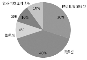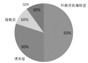 建议投资者在基金的大类资产配置上可采取以股为主、股债结合的配置策略。具体建议如下:积极型投资者可以配置50%的积极投资偏股型基金,10%的指数型基金,10%的QDII基金,30%的债券型基金;稳健型投资者可以配置30%的积极投资偏股型基金,10%的指数型基金,10%的QDII基金,40%的债券型基金,10%的货币市场基金或理财债基;保守型投资者可以配置20%的积极投资偏股型基金,40%的债券型基金,40%的货币市场基金或理财债基。