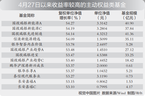 伴随着新能源板块的快速反弹,新能源主题基金及重仓新能源板块的基金也大幅“回血”。整体来看,多数基金净值上涨。以反弹幅度较高的信澳新能源精选为例,4月27日以来,该基金净值累计涨幅达到54%。根据一季度报告,该基金重仓股有比亚迪、天齐锂业、盐湖股份等,其中比亚迪4月27日以来累计涨幅为48.22%。