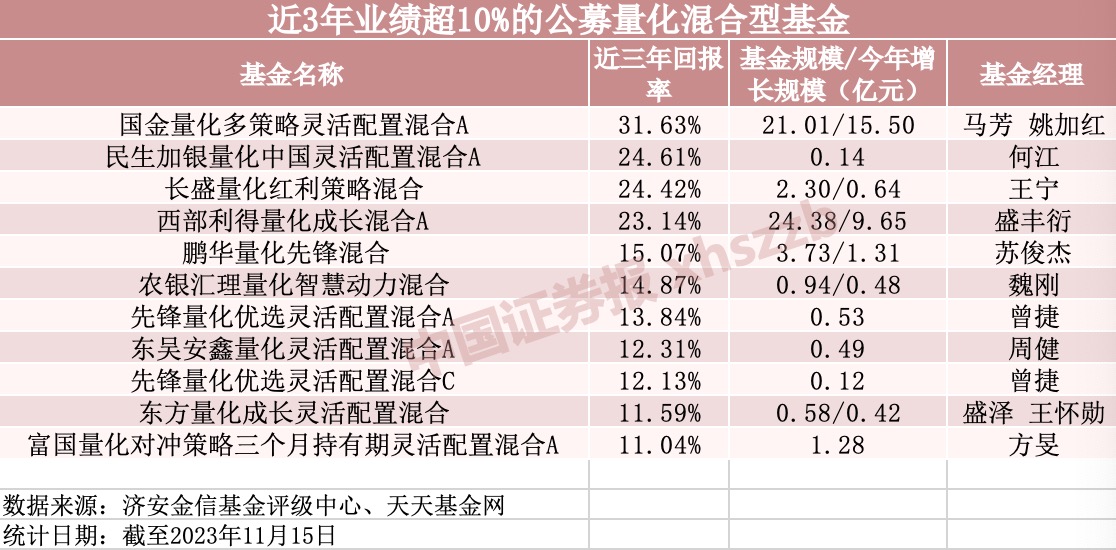 数据显示,在11只近三年业绩超10%的混合型量化基金中,有6只在今年实现规模正增长。其中,国金量化多策略灵活配置混合A今年来规模增长15.50亿元,西部利得量化成长混合A今年来规模增长9.65亿元。上述2只基金的现有规模均超过了20亿元,位居前列。