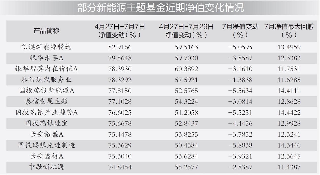 7月,多只新能源主题基金净值回撤超10%。此前,在4月27日市场出现阶段性低点后,新能源主题基金充当了“反弹急先锋”的角色,部分产品净值一度反弹超80%。