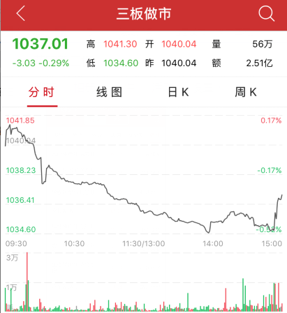 截至收盘,三板做市指数报1037.01点,跌3.03点,跌幅0.29%,成交额2.51亿元。返回搜狐,查看更多