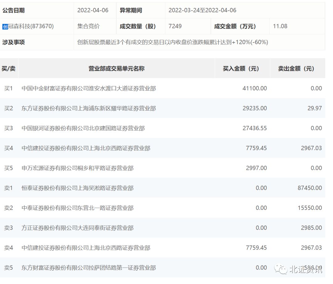 冠森科技近期表现活跃,在4月6日当天飙涨92.61%,因最近3个有成交的交易日涨幅达到1.2倍而登上龙虎榜。中金财富淮安水渡口大道证券营业部、东方证券上海浦东新区耀华路证券营业部和银河证券北京建国路证券营业部分别买入4.11万元、2.92万元和2.74万元。