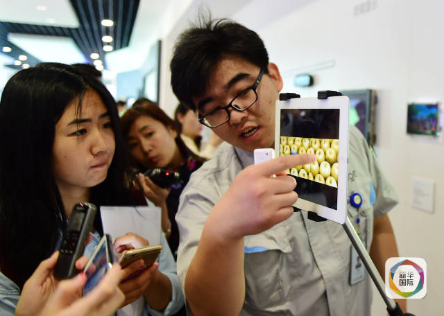 2016年5月12日,京东方的工作人员在北京向参观者展示一项色弱矫正显示技术。( 新华社记者张晨霖摄)