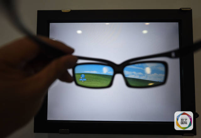 2017年1月11日,工作人员在京东方展厅内介绍“防窥显示”技术,正常看空无一物的显示屏,带上眼镜就能看到清晰的操作界面。(新华社记者罗晓光摄)