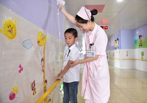 福建省福州儿童医院牵头组建了福州市儿科医联体。图为福州儿童医院病房大楼内,护士在陪护一名小患者。