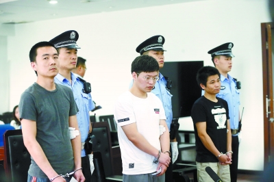 嫌疑人申欢(左)、李超(中)、余秋云(右)受审。
