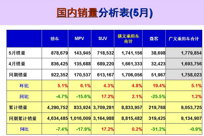 中国证券网讯 记者8日从全国乘联会获悉,中国5月份广义乘用车销量178万辆,同比增长1.2%,环比增长5.1%。中国1-5月份广义乘用车销量同比下跌0.9%。