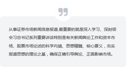从事证券市场新闻信息报道,最重要的就是深入学习、深刻领会习总书记系列重要讲话特别是有关新闻舆论工作和资本市场、股票市场论述的科学内涵、思想精髓、核心要义,夯实报道思想的理论之基,确保正确引导舆论、正面影响市场。