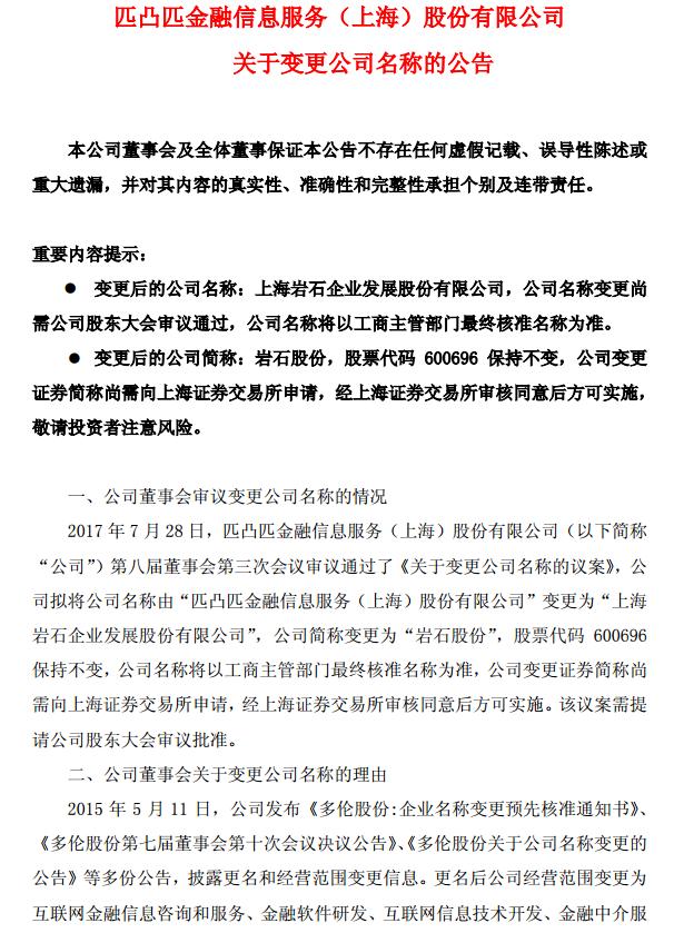 *ST匹凸(600696)30日晚公告,为了摆脱因不当更名对公司造成的不良影响,公司拟将名称由“匹凸匹金融信息服务(上海)股份有限公司”变更为“上海岩石企业发展股份有限公司”,简称变更为“岩石股份”。