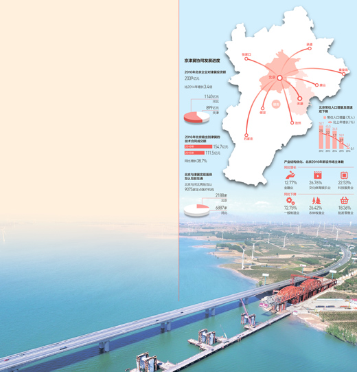 牵住疏解非首都功能的牛鼻子。3年间,市场疏解了,企业搬迁了,新建先进企业成建制落地河北。从过去的资源虹吸,到今天的辐射带动,北京与津冀两地的关系发生了深刻变化。创新协同,中关村从一个变成3个,保定中关村、滨海新区中关村。绿色转型,首钢在曹妃甸自我革命,成为零排放的绿色大型钢企,技术水准达到世界先进水平。融合发展,首农在京津冀建起产业链,大型生产基地入冀,先进的生产管理技术与广阔的乡村腹地融合,实现城乡双赢。在重大产业合作项目的带动下,北京对津冀的投资呈井喷态势,2016年京企在津冀的投资达到2039亿元,比2014年增长了3.4倍。