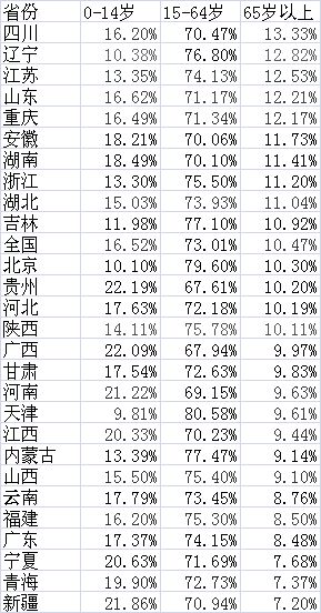 东部沿海的江苏和浙江65岁人口占比较高,也与这两省的城镇化率较高、0-14岁人口占比较低有关。不过这两个省份经济发达,外来人口流入较多,所以15-64岁年龄段人口占比都高于全国水平。另一方面,也由于经济发达,老百姓收入较高,医疗教育基础雄厚,因此预期的寿命也比较高,这也影响了65岁以上的人口占比。