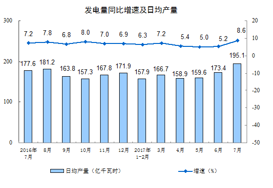 分产品看,7月份,596种产品中有398种产品同比增长。其中,钢材9667万吨,同比增长2.7%;水泥21283万吨,下降0.9%;十种有色金属447万吨,同比持平;乙烯148万吨,增长1.0%;汽车207.3万辆,增长4.3%;轿车86.6万辆,下降3.7%;发电量6047亿千瓦时,增长8.6%;原油加工量4550万吨,增长0.4%。