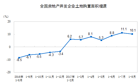 1-8月份,房地产开发企业土地购置面积14229万平方米,同比增长10.1%,增速比1-7月份回落1个百分点;土地成交价款6609亿元,增长42.7%,增速提高1.7个百分点。