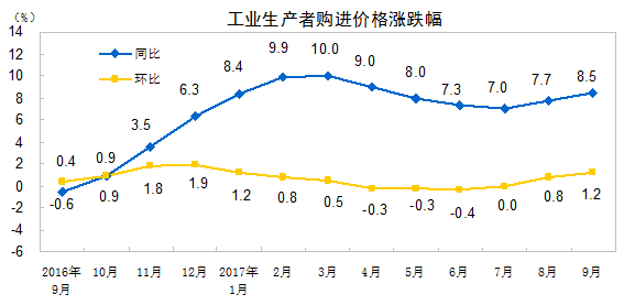 2017年9月份,全国工业生产者出厂价格同比上涨6.9%,环比上涨1.0%。工业生产者购进价格同比上涨8.5%,环比上涨1.2%。1-9月平均,工业生产者出厂价格同比上涨6.5%,工业生产者购进价格同比上涨8.4%。