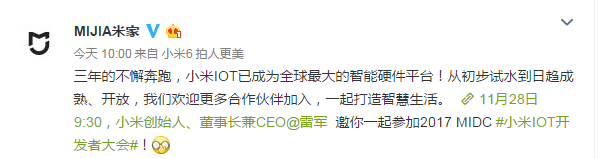 中国证券网讯 记者22日从北京小米移动软件有限公司官方微博“MIJIA米家”获悉,2017 MIDC小米IOT开发者大会将于11月28日召开。