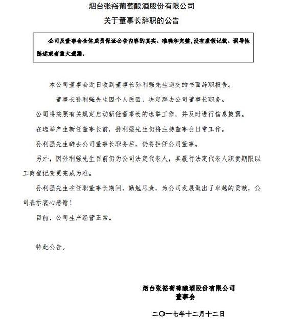 12月11日下午,烟台张裕葡萄酿酒股份有限公司发布公告称,公司董事长孙利强因个人原因决定辞去董事长一职。