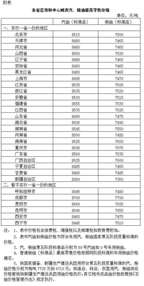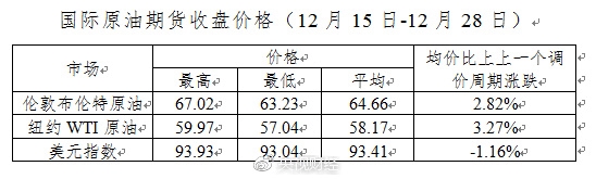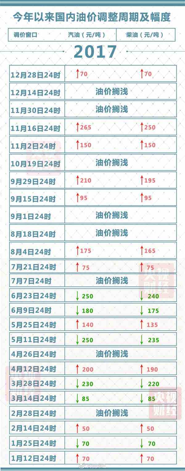 根据近期国际市场油价变化情况,按照现行成品油价格形成机制,自2017年12月28日24时起,国内汽、柴油价格(标准品,下同)每吨均提高70元。调整后,各省(区、市)和中心城市汽、柴油最高零售价格见附表。相关价格联动及补贴政策按现行规定执行。