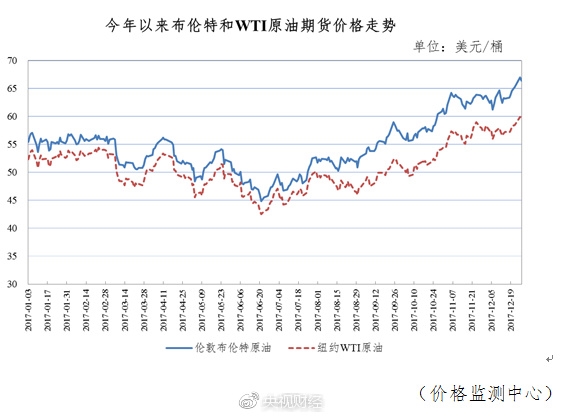 因美国原油库存稳步下降、欧佩克减产执行率提高、利比亚和北海地区石油供应中断,油价持续上涨。据美国能源信息协会周报数据,美国原油库存连续五周下降至4.36亿桶,为2015年10月以来最低。欧佩克报告显示,11月欧佩克与俄罗斯等产油国减产协议执行率达到122%。在全球原油过剩局面逐步缓解的情况下,近期北海地区和利比亚两起大型原油供应中断事件进一步推动国际油价攀升。12月27日,布伦特原油期货价格突破67美元,为2015年5月以来最高水平。