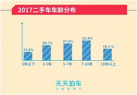 当下,随着消费升级,二手车车龄明显“年轻化”。据天天拍车大数据报告显示,2017年度有超过一半的二手车车龄不到7年。其中,3年以下车龄的二手车占比为15.8%;3-5年车龄的占比为20.1%;5-7年车龄的占比为21.9%;7-10年车龄的二手车占比为23.9%;10年以上车龄的二手车占比为18.3%。
