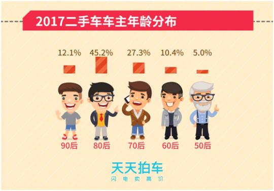 在2017卖车车主的年龄分布统计中,“80后”车主占比为45.2%,“70后”车主占比为27.3%,“90后”车主占比亦达12.1%。