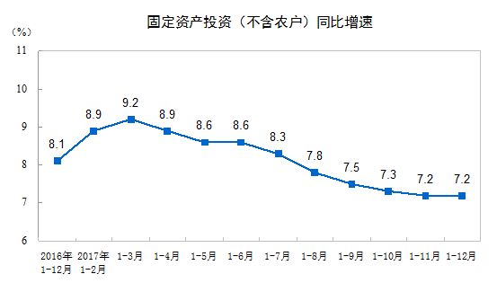 2017年,全国固定资产投资(不含农户)631684亿元,比上年增长7.2%,增速与1-11月份持平。从环比速度看,12月份比11月份增长0.53%。