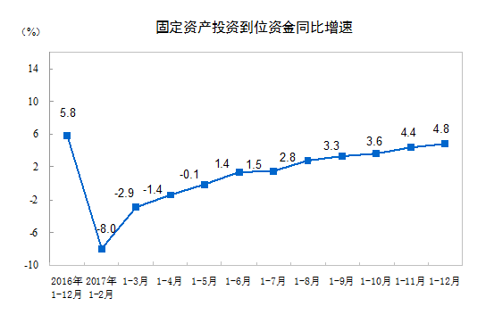 从到位资金情况看,固定资产投资到位资金629815亿元,比上年增长4.8%,增速比1-11月份提高0.4个百分点。其中,国家预算资金增长7.8%,增速回落1.7个百分点;国内贷款增长9.0%,增速回落0.3个百分点;自筹资金增长2.3%,增速提高0.6个百分点;利用外资比上年下降3.1%,降幅收窄0.7个百分点;其他资金比上年增长11.6%,增速提高0.5个百分点。