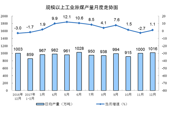 12月份,原煤产量3.1亿吨,同比增长1.1%,增速由负转正;日均产量1015.7万吨,比11月份增加15.8万吨。1-12月份,原煤产量34.5亿吨,同比增长3.2%。