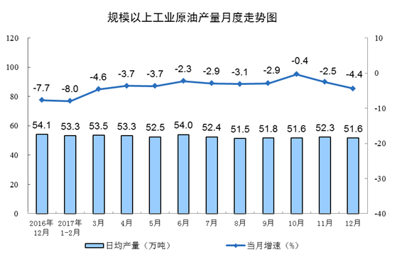 受油田后备资源接替不足、计划性减产及寒潮天气等因素影响,原油生产持续下降。12月份,原油产量1598.4万吨,同比下降4.4%,降幅比11月份扩大1.9个百分点;日均产量51.6万吨,比11月份减少0.8万吨。1-12月份,原油产量1.9亿吨,同比下降4.0%。