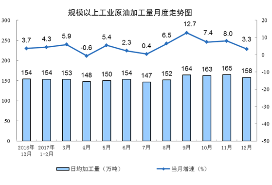 受企业停产检修等因素影响,原油加工量增速放缓。12月份,原油加工量同比增长3.3%,增速比11月份回落4.7个百分点;日均加工量158.4万吨,比11月份减少6.3万吨。主要成品油生产增速均有回落,其中汽油、煤油和柴油产量增速分别比11月份回落7.8、1.3和2.9个百分点。1-12月份,原油加工量5.7亿吨,同比增长5.0%。