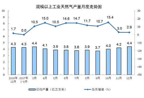 随着煤炭减量替代政策的实施、“煤改气”工程的推进,国内天然气消费需求量持续攀高,12月份,天然气产量136.1亿立方米,月产量为历史新高,同比增长2.9%,增速与11月份基本持平;日均生产4.4亿立方米,比11月份增加0.2亿立方米。1-12月份,天然气产量1474.2亿立方米,同比增长8.5%。