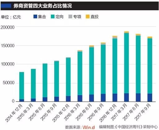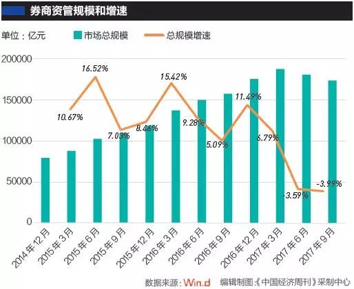 《中国经济周刊》记者注意到,在2017年一季度券商资管规模创新高后,开始呈现逐渐降低的态势,2017年二季度为180975亿元、三季度为173746亿元。一位不愿具名的券商人士对《中国经济周刊》记者解释说:“对券商的强监管从2016年开始,对券商资管业务的监管则是从2017年2月份开始,因此券商资管规模从去年二季度开始降低。不过,目前的监管是大资管监管,并不针对券商,也包括银行、基金、信托等,主要的目的还是去通道和去杠杆。”