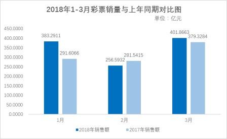 1月至3月累计,乐透数字型彩票销售640.31亿元,同比增加33.21亿元,增长5.5%;竞猜型彩票销售227.05亿元,同比增加60.29亿元,增长36.2%;即开型彩票销售59.45亿元,同比减少4.49亿元,下降7.0%;视频型彩票销售114.62亿元,同比增加0.40亿元,增长0.3%;基诺型彩票销售0.32亿元,同比减少0.13亿元,下降28.4%。1月至3月份乐透数字型、竞猜型、即开型、视频型和基诺型彩票销售量分别占彩票销售总量的61.46%、21.80%、5.71%、11.00%、0.03%。