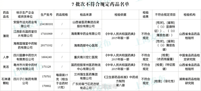 中证网讯 上海发布5月13日消息,国家药品监督管理局通报:标示为安国市远光药业有限公司、江西彭氏国药堂饮片有限公司、海南国瑞堂中药制药有限公司生产的3批次薄荷、标示为四川固康中药饮片有限责任公司生产的1批次人参等7批次药品不符合规定。不符合规定项目为农药残留量、性状等。