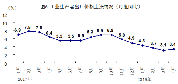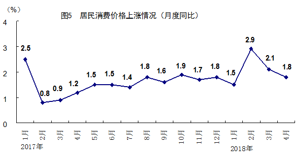 4月份,全国居民消费价格同比上涨1.8%,涨幅比上月回落0.3个百分点,环比下降0.2%。分类别看,食品烟酒价格同比上涨1.1%,衣着上涨1.1%,居住上涨2.2%,生活用品及服务上涨1.5%,交通和通信上涨1.1%,教育文化和娱乐上涨2.0%,医疗保健上涨5.2%,其他用品和服务上涨0.9%。1-4月份,全国居民消费价格同比上涨2.1%。4月份,全国工业生产者出厂价格同比上涨3.4%,涨幅比上月扩大0.3个百分点,环比下降0.2%。1-4月份,全国工业生产者出厂价格同比上涨3.6%。4月份,全国工业生产者购进价格同比上涨3.7%,环比下降0.3%。1-4月份,全国工业生产者购进价格同比上涨4.2%。