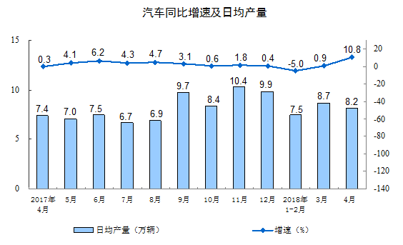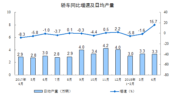 分产品看,4月份,596种产品中有396种产品同比增长。其中,钢材9227万吨,同比增长8.5%;水泥21072万吨,增长3.2%;十种有色金属454万吨,增长3.1%;乙烯152万吨,增长1.9%;汽车245.0万辆,增长10.8%;轿车100.2万辆,增长15.7%;发电量5108亿千瓦时,增长6.9%;原油加工量4958万吨,增长11.5%。