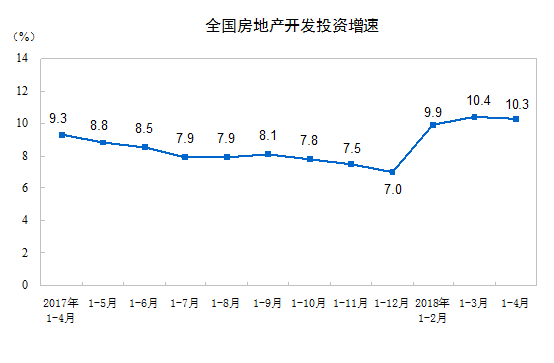 2018年1-4月份,全国房地产开发投资30592亿元,同比名义增长10.3%,增速比1-3月份回落0.1个百分点。其中,住宅投资21331亿元,增长14.2%,增速提高0.9个百分点。住宅投资占房地产开发投资的比重为69.7%。