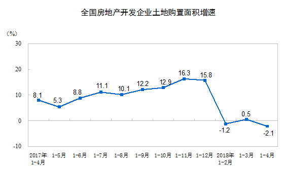 1-4月份,房地产开发企业土地购置面积5412万平方米,同比下降2.1%,1-3月份为增长0.5%;土地成交价款2391亿元,增长13.6%,增速回落6.7个百分点。